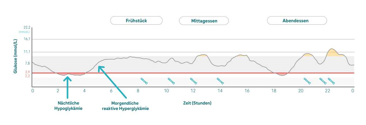 💡Wenn Sie den Eindruck haben, dass Ihre Basalinsulinversorgung nachts zu niedrig ist, besprechen Sie mit Ihrem medizinisches Fachpersonal, ob es notwendig ist, Ihre Therapie anzupassen.